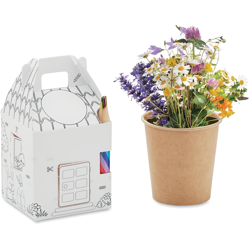 Anbausatz für Kinder. Enthält einen naturfarbenen Papptopf, Samen für Honigblumen und einen mehrfarbigen Malstift.