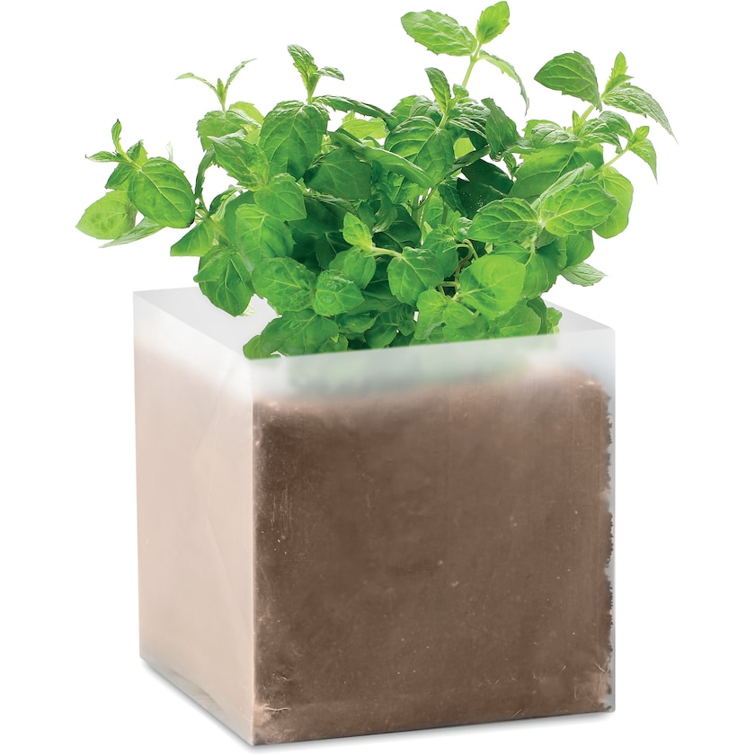 Set für den Anbau von Minze. Geben Sie etwa 30 cl Wasser hinzu und Sie erhlten 1 Liter Pflanzerde, aus dem bald schöne Minze sprießen wird. Die Bedruckung erfolgt 1-farbig auf der Verpackung.