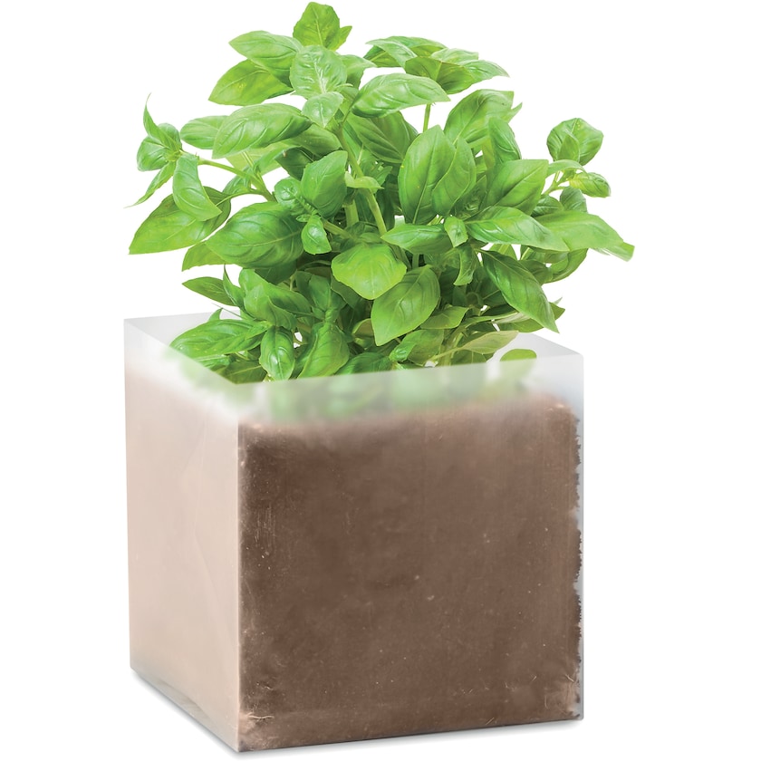 Kleines Set für die Anzucht von Basilikum. Geben Sie nur 30 cl Wasser hinzu und Sie erhalten 1 Liter Pflanzerde, aus der schon bald Basilikum wächst. Der Druck erfolgt im 1-Farbdruck.