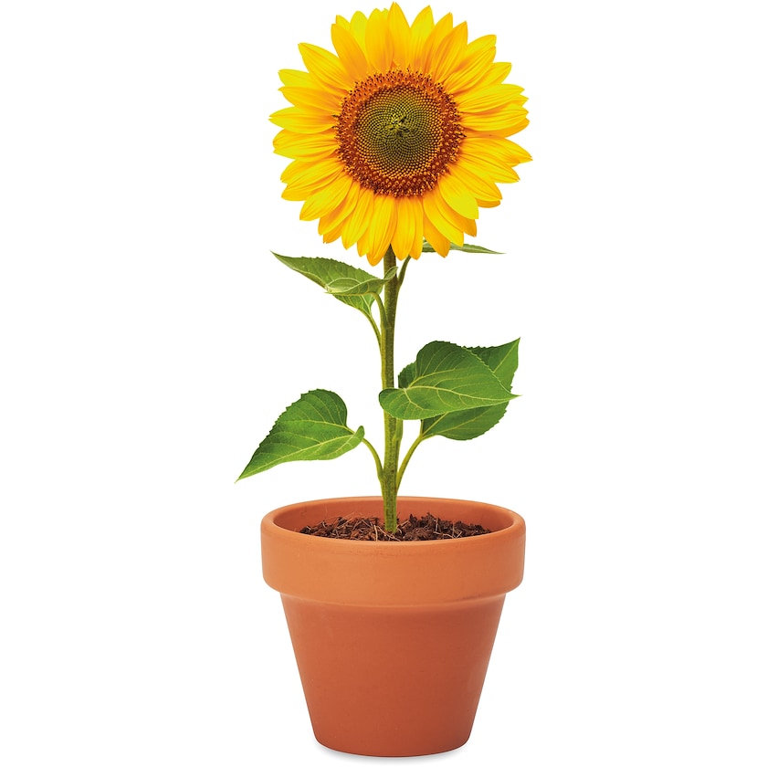 Kleiner Blumentopf mit Sonnenblumensamen. Die Werbeanbringung kann entweder per Druck oder Lasergravur auf dem Blumentopf oder per Druck auf der Oberseite der Kartonhülle erfolgen. Beim Druck ist nur eine Farbe möglich. Hergestellt in der EU. Lassen Sie es blühen!