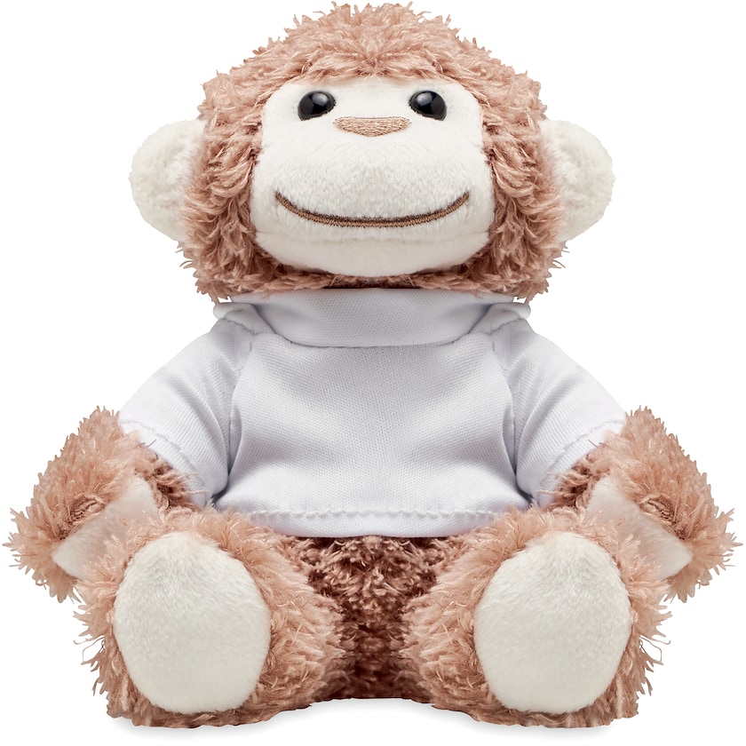 Ein fröhlicher und verschmuster Affe in einem weißen Hoodie. Gedruckt wird auf den Hoodie.