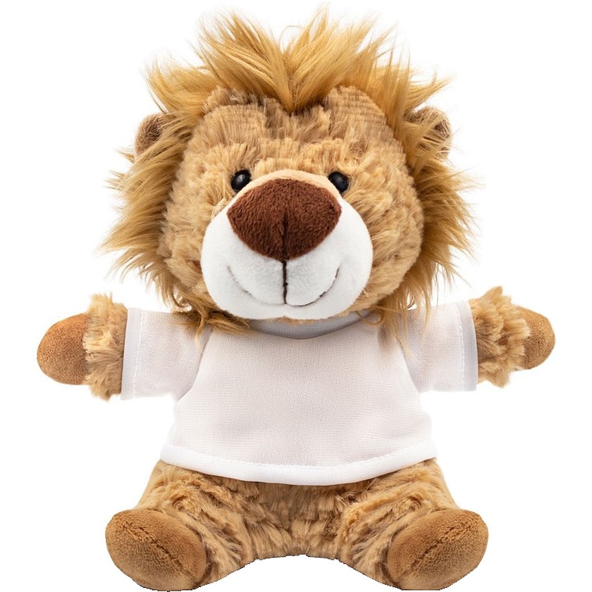 Ein Löwe, der sowohl freundlich als auch flauschig ist. Der Aufdruck befindet sich auf dem weißen T-Shirt. Das T-Shirt wird separat vom Stofftier geliefert.