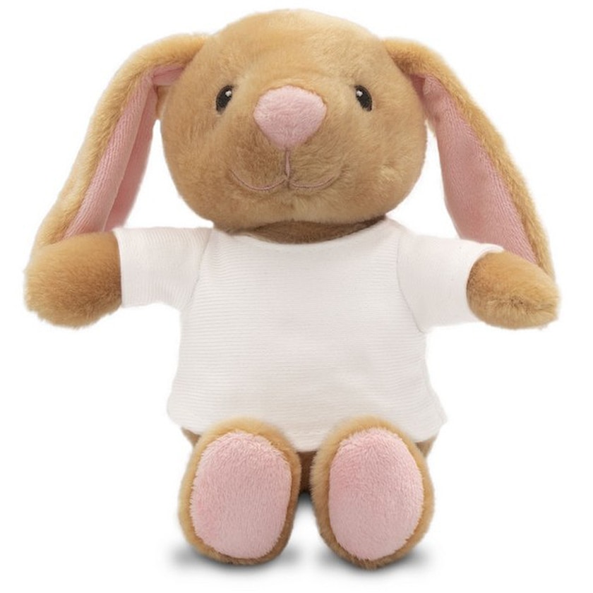 Verschmustes Kaninchen mit weißem T-Shirt. Honey wird aus recycelten PET-Flaschen (rPET) hergestellt und ist nach dem Global Recycled Standard zertifiziert. Der Druck wird auf dem T-Shirt platziert, das separat zum Kuscheltier geliefert wird.