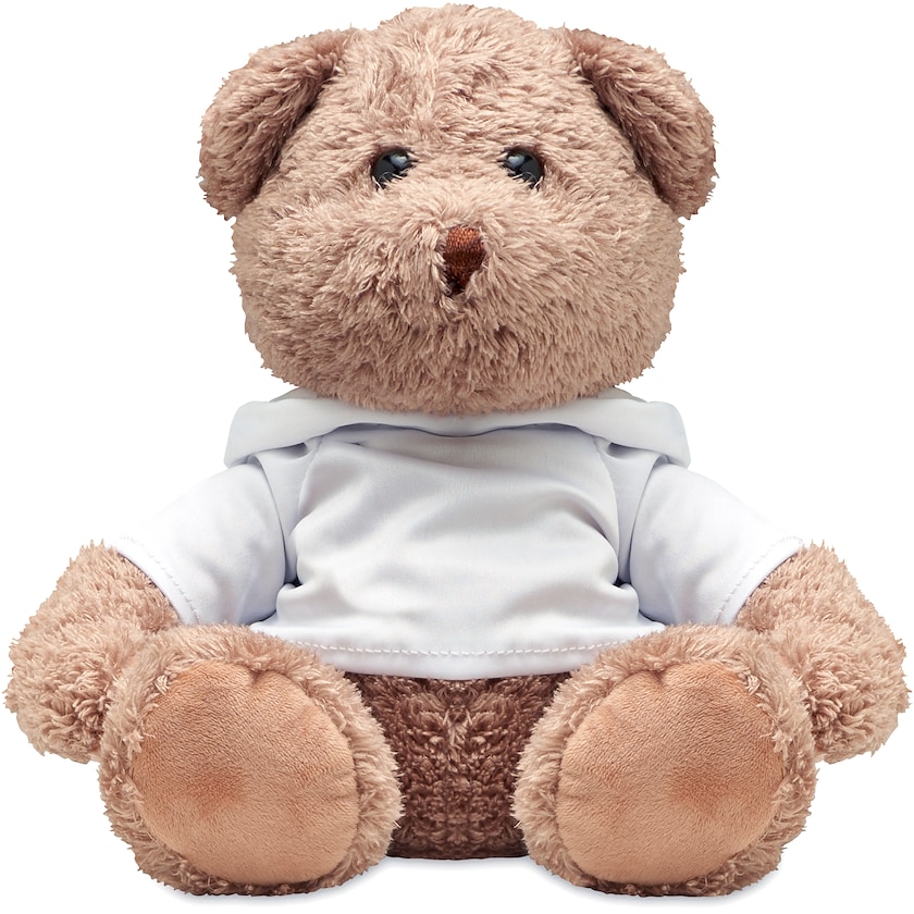 Großer Teddybär mit weißem Hoodie. Der Druck wird auf dem Hoodie platziert.