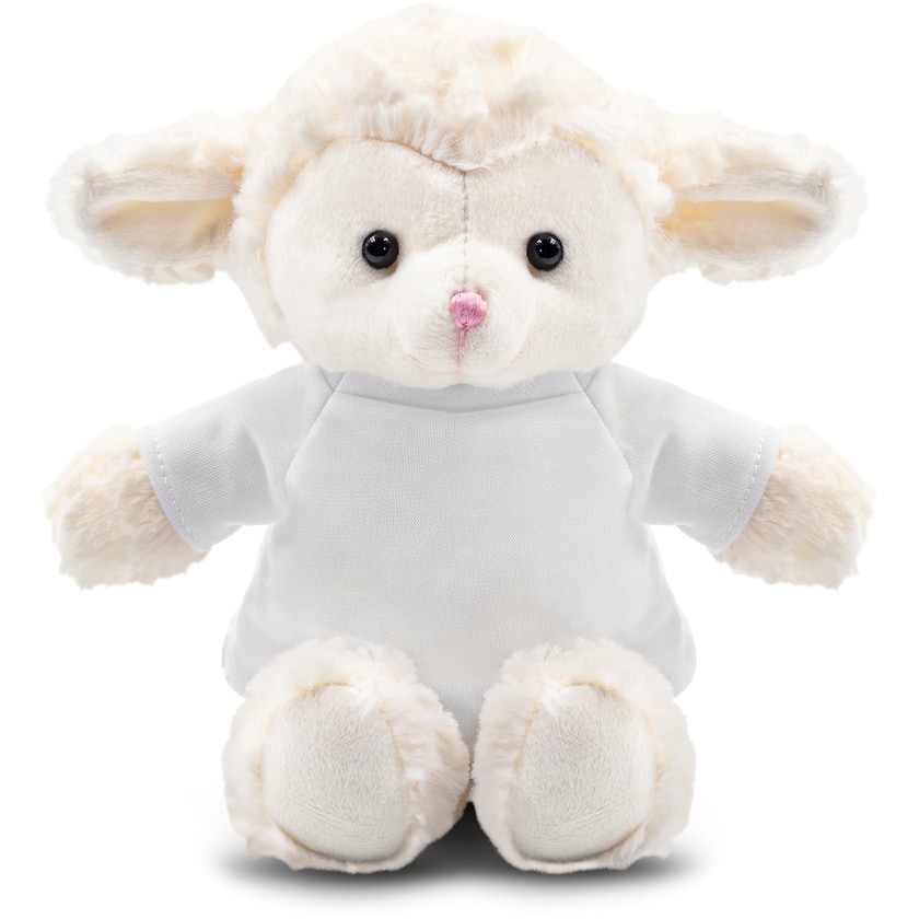 Ein süßes Lamm mit weißem T-Shirt. Der Aufdruck befindet sich auf dem T-Shirt (das getrennt vom Lamm verpackt ist). Ein süßes Lamm, das sehr kuschelig ist.