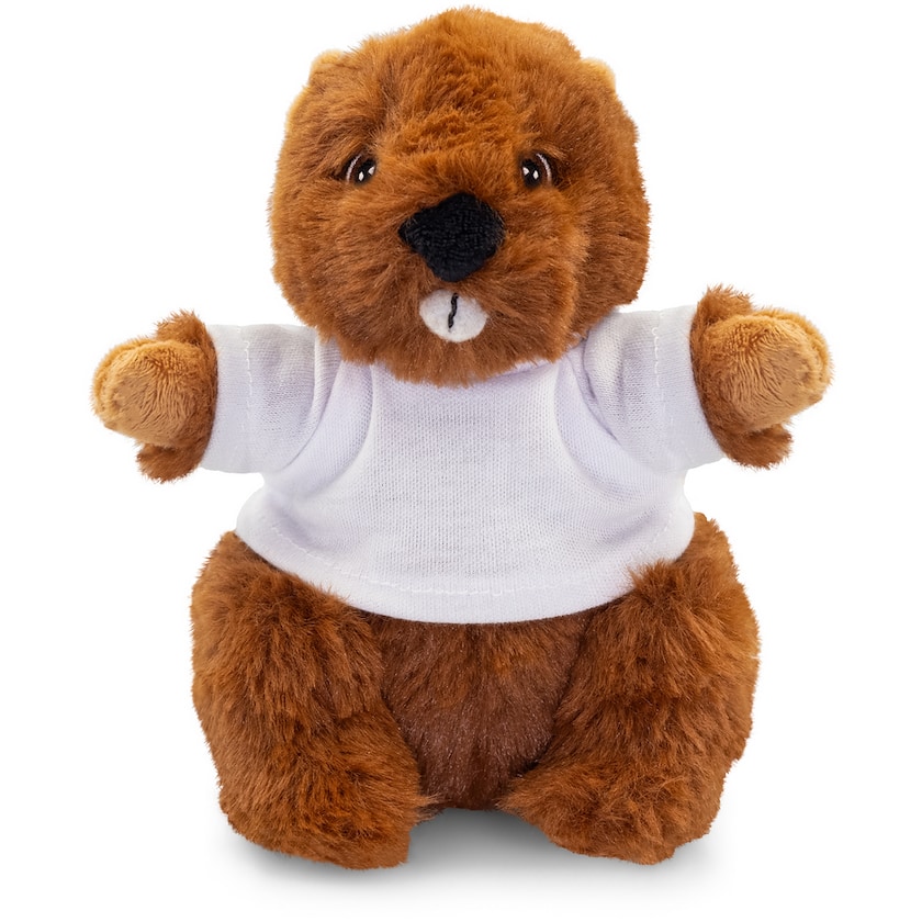 Süßer Biber mit weißem T-Shirt, auf dem sich der Aufdruck befindet. Wird das Produkt ohne Aufdruck bestellt, wird das T-Shirt separat vom Stofftier verpackt.