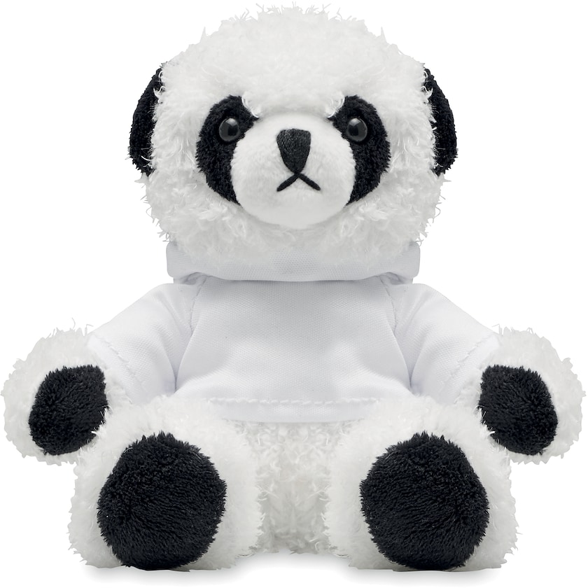 Ein süßer Panda in einem weißen Hoodie. Der Hoodie hat eine hochklappbare Kapuze. Der Druck wird auf dem Hoodie angebracht.