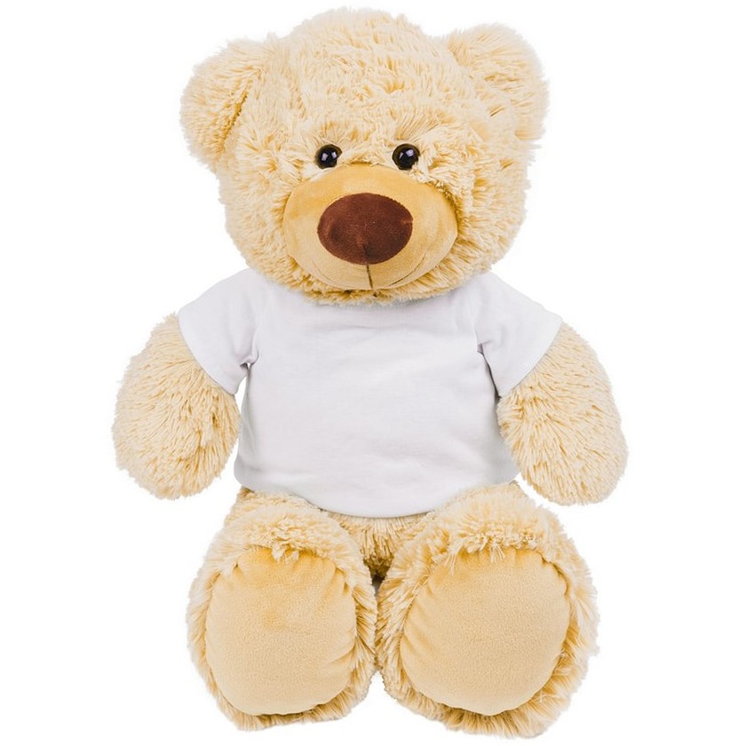 Gemütlicher Teddybär mit weißem T-Shirt. Der Druck erfolgt auf dem T-Shirt. Das T-Shirt ist getrennt vom Teddybär verpackt.
