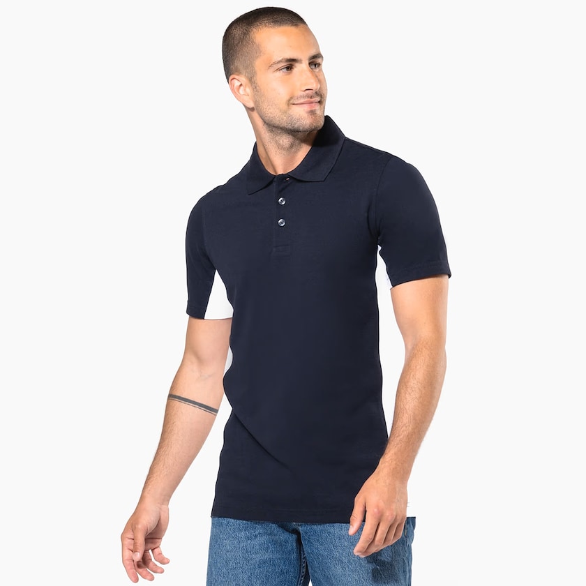 Sportliches Polo-Shirt mit kontrastierenden Ärmeln und Körperseiten. Die Polo-Shirts werden einzeln verpackt in Plastikhüllen geliefert.