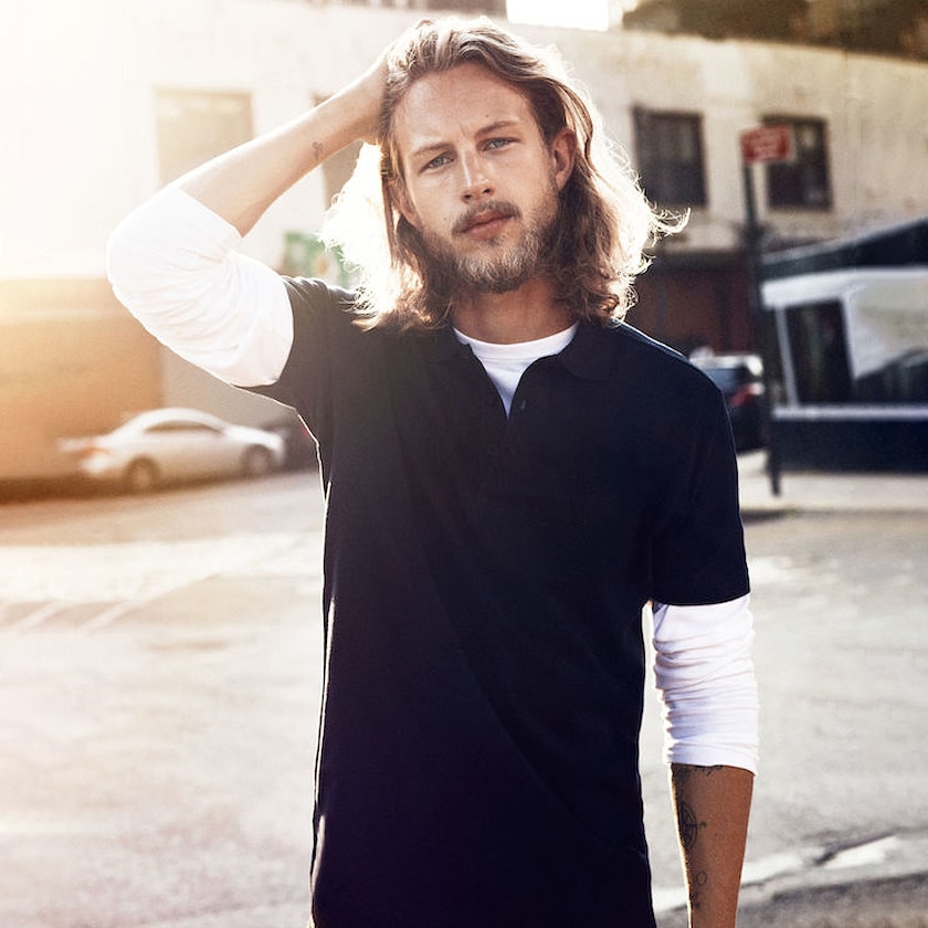 Polo-Shirt aus widerstandsfähiger Polyestermischung. Das Polo-Shirt hat Schlitze an den Seiten und drei Knöpfe am Halsausschnitt.