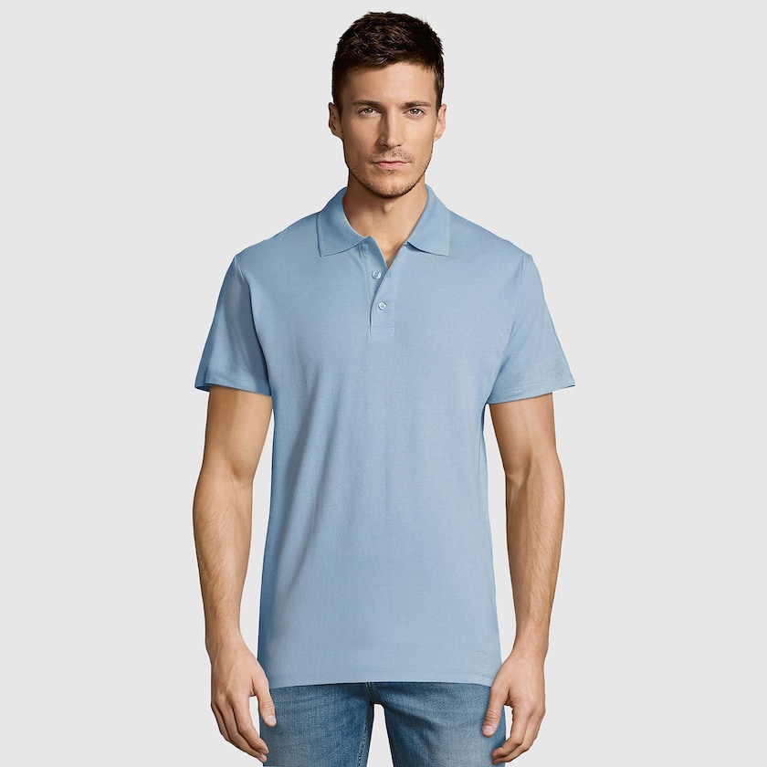Herrenpolo bedrucken aus einem 170 g/m² Baumwollstoff. Das Poloshirt hat eine moderne Passform und drei Ton-in-Ton-Knöpfe am Halsausschnitt. Der Stoff ist ECO-TEX zertifiziert. Gibt es auch als Damenmodell.