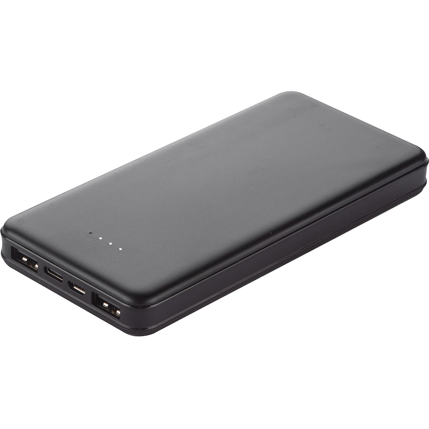 Leistungsstarke Powerbank im stilvollen Design. Kann über drei verschiedene USB-Anschlüsse aufgeladen werden: Typ A, Micro-USB und Typ C. Ist CE-gekennzeichnet und hat eine einjährige Garantie. Micro-USB-Kabel enthalten.