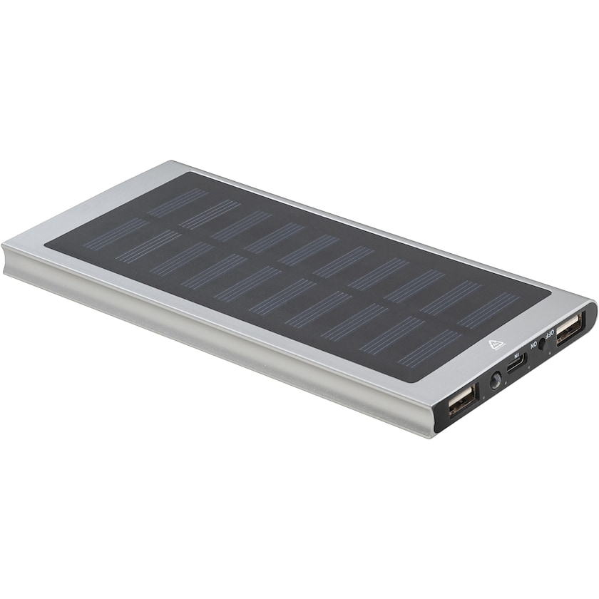 Powerbank aus recyceltem Aluminium mit Solarpanel. USB-A/USB-C-Kabel im Lieferumfang enthalten. Lieferung erfolgt im naturfarbenen Karton.