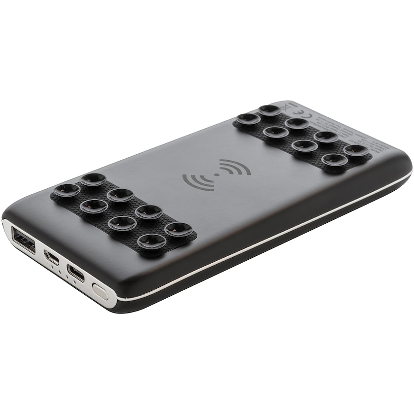 Leistungsstarke Powerbank mit Lasergravur, die beim Ladenvorgang leuchtet. Riley hat kräftige Saugnäpfe zum Befestigen am Handy. Neben drahlosem Laden kann auch über einen USB- oder C-Port geladen werden. Output: 5V/2,1A, Input: 5V/1,5A. Wireless Output 5V/1A 5W. Registriertes Design®.