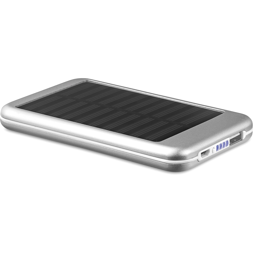 Bedruckbare Powerbank mit Solarzellenladung. Die Powerbank besteht aus Aluminium und kann Ihr Handy bei voller Ladung etwa zweimal aufladen. Micro-USB-Kabel im Lieferumfang enthalten.