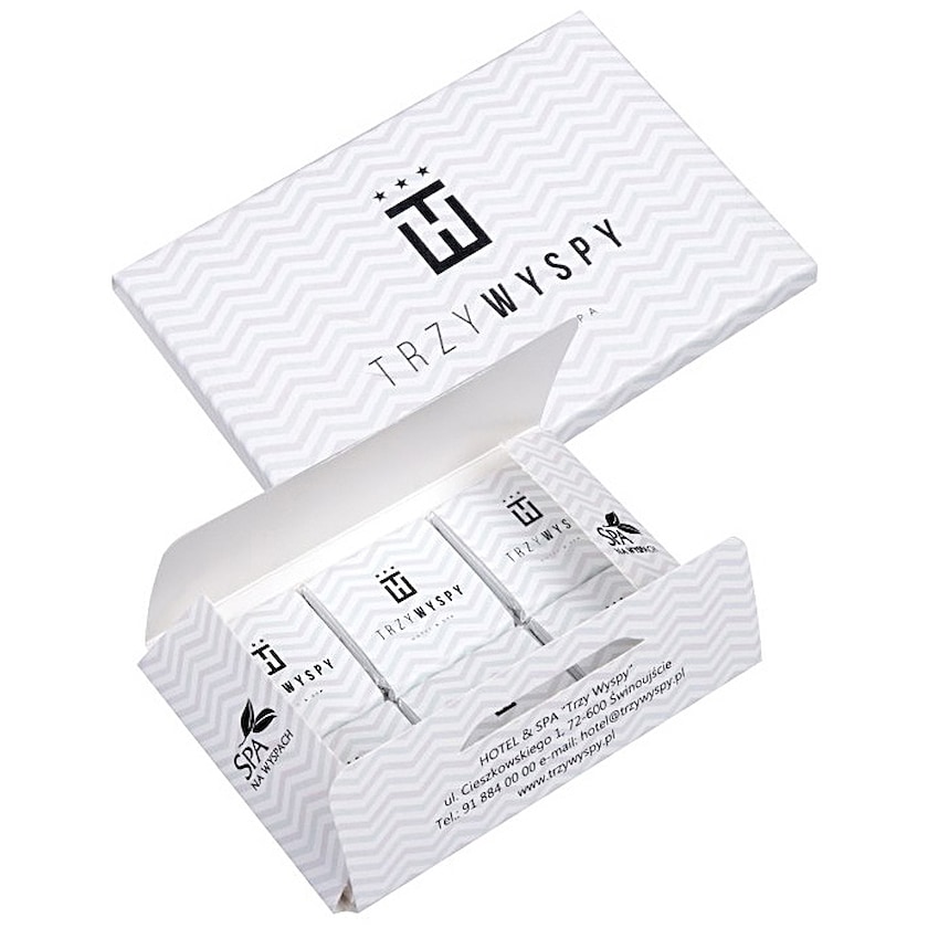 Schokoladenschachtel mit 6 Schokoladenstückchen á 5 g. Die Folie ist in silber, gold, blau, rot oder schwarz erhältlich. Die Schachten und das Papier um den Schokoladenstückchen wird nach Ihren Wünschen mit 4-Farb-Fotodruck bedruckt.
