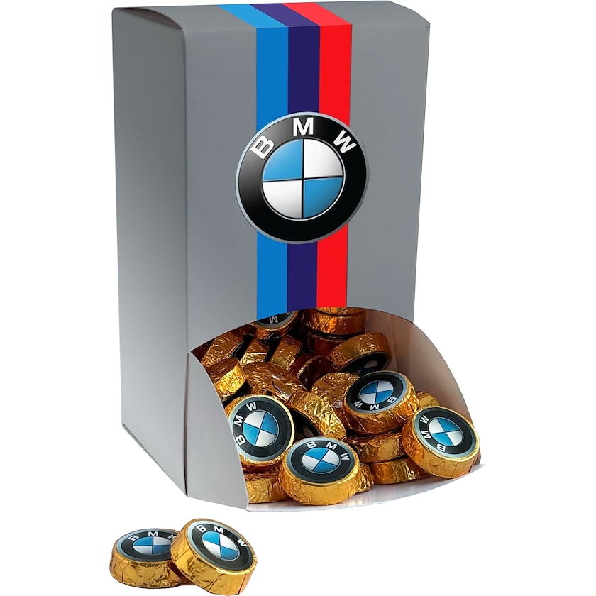 Große Pappschachtel gefüllt mit runden Schokoladenstücken mit Goldfolie. Die Schokoladenstücke bestehen aus hochwertiger Schokolade mit mindestens 50 % Kakaoanteil. Die Außenseite des Kartons wird ganz nach Ihren Wünschen bedruckt. Die Schokoladenstücke werden mit einem Etikett mit Ihrem Aufdruck versehen.
