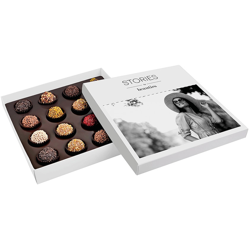 Große Schokoladenschachtel mit 16 Schokoladenpralinen. Die Schokoladenpralinen sind absolut höchste Qualität und kommen in gemischten Geschmacksrichtungen. Die ganze Verpackung wird nach Ihren Wünschen mit 4-Farb-Fotodruck bedruckt. Ein perfektes Geschenk für wichtige Kunden!