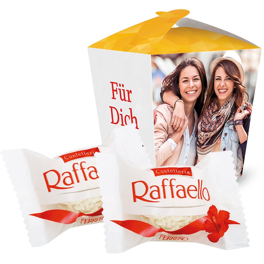 Pappschachtel mit 2 Ferrero Raffaello. Raffaello ist die einzigartige und exklusive Kombination aus leichter Waffel, cremiger Füllung, einer gerösteten Mandel und weißem Kokos. Die ganze Verpackung wird nach Ihren Wünschen bedruckt.