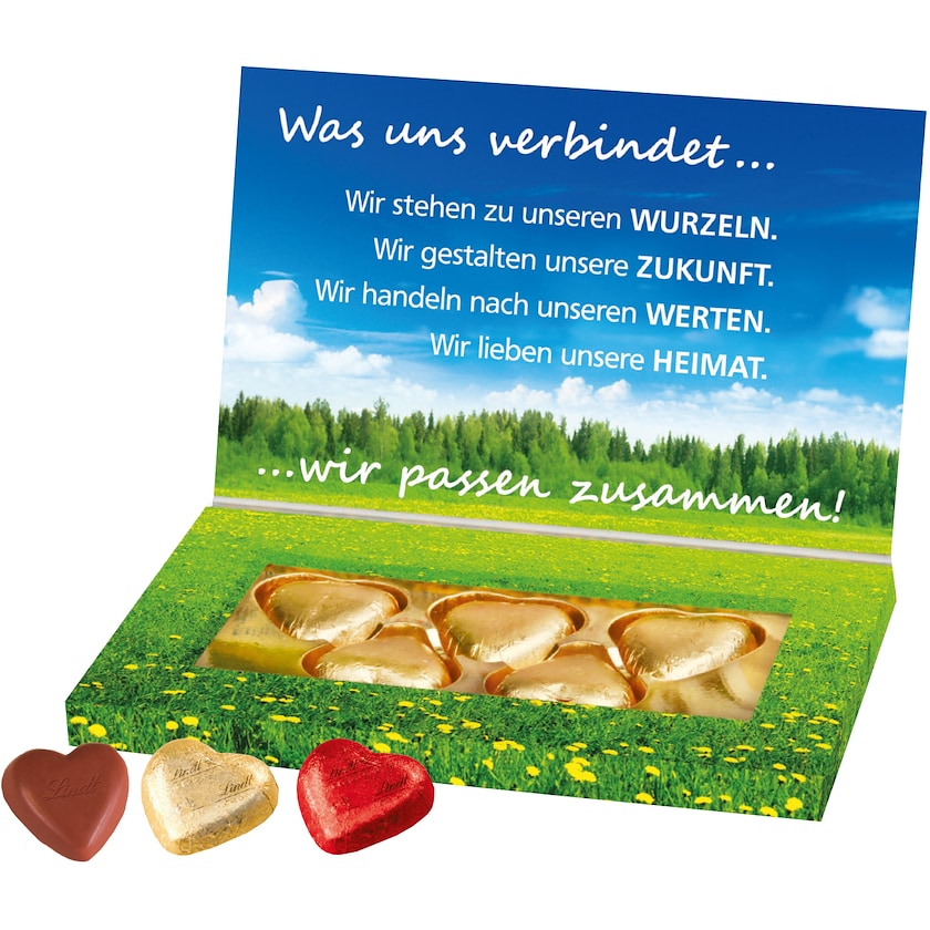 Ein Geschenk der Fürsorge! Pralinenschachtel mit 5 Schokoherzen von Lindt. Die Verpackung wird nach Ihren Wünschen mit 4-Farbdruck versehen und mit eine transparenten Plastikhülle verschlossen.