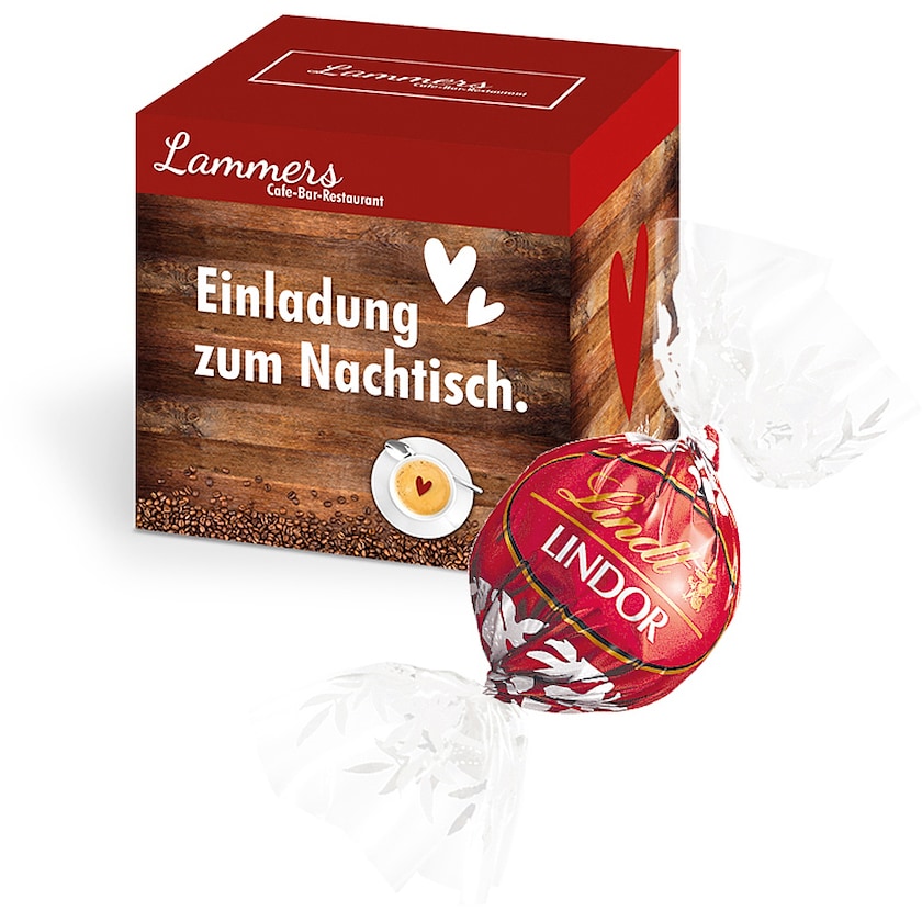 Kleine Pappverpackung mit 1 Stück Lindt Lindor. Die Pappverpackung wird nach Ihren Wünschen bedruckt. Schokoladenkugel in gemischten Geschmacksrichtungen.