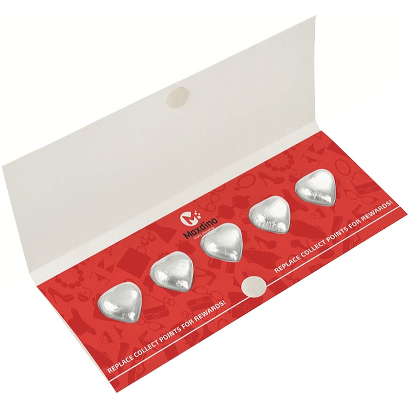 Schokladenschachtel mit fünf Schokoladenherzen aus Milchschokolade. Die ganze Schokladenschachtel wird nach Ihren Wünschen bedruckt. Wählen Sie zwischen silberfarbener, goldfarbener oder roter Folie.