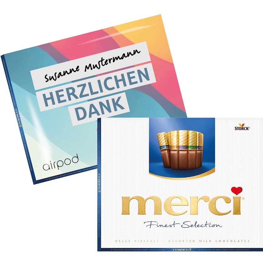 Merci Pralinenschachtel mit Außenverpackung, die sich individuell bedrucken lässt. Die Pralinenschachtel enthält 250 Gramm Schokolade mit einer Auswahl an acht klassischen Geschmacksrichtungen: Nougat, Milchschokolade, Mandel, Kaffeecreme, Marzipan, dunkle Milchschokolade, dunkle Mousse und Milchpraline.