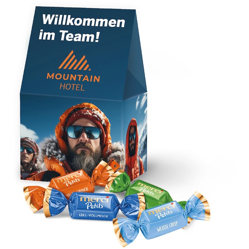 Bedruckbare Pralinenschachtel, gefüllt mit köstlichen Merci Petits. Diese Pralinenschachtel enthält 5 Schokoladenstücke in verschiedenen Geschmacksrichtungen. Laden Sie die Druckvorlage herunter und gestalten Sie Ihre einzigartige Pralinenschachtel. Sie ist ideal, um wichtigen Kunden zu danken oder neue Mitarbeiter willkommen zu heißen.
