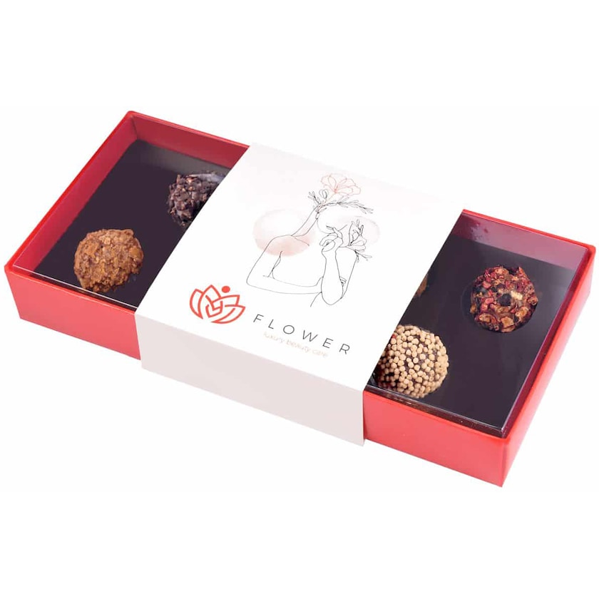 Pralinenschachtel mit 8 luxuriösen Schokoladentrüffeln. Die Schokoladentrüffel gibt es in den gemischten Geschmacksrichtungen Kirsche, dunkle Orange, Calvados und Maracuja. Gedruckt wird auf einen Papierbanner, der um die Pralinenschachtel gelegt wird. Sie bestimmen aber auch den Druck auf dem Karton und seiner Innenseite.