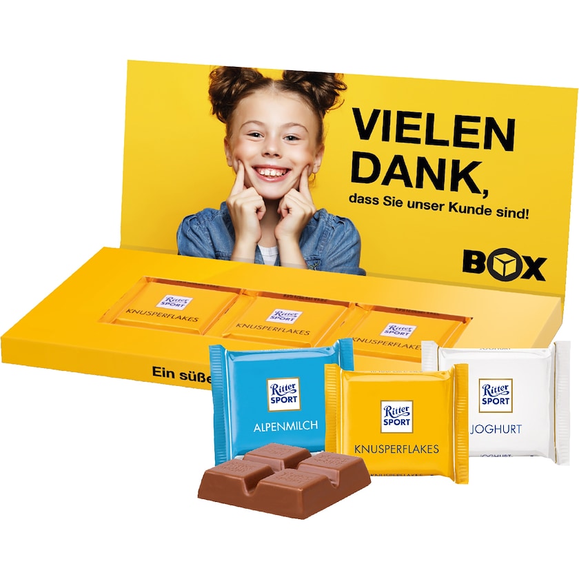 Pralinenschachtel gefüllt mit drei Ritter Sport Mini. Die gesamte Pralinenschachtel wird nach Ihren Wünschen gestaltet. Gemischt in den Geschmacksrichtungen Alpenmilch, Joghurt, Knusperflocken, Marzipan und Nusssplitter. Auf Wunsch kann auch nur eine Geschmacksrichtung ausgewählt werden.