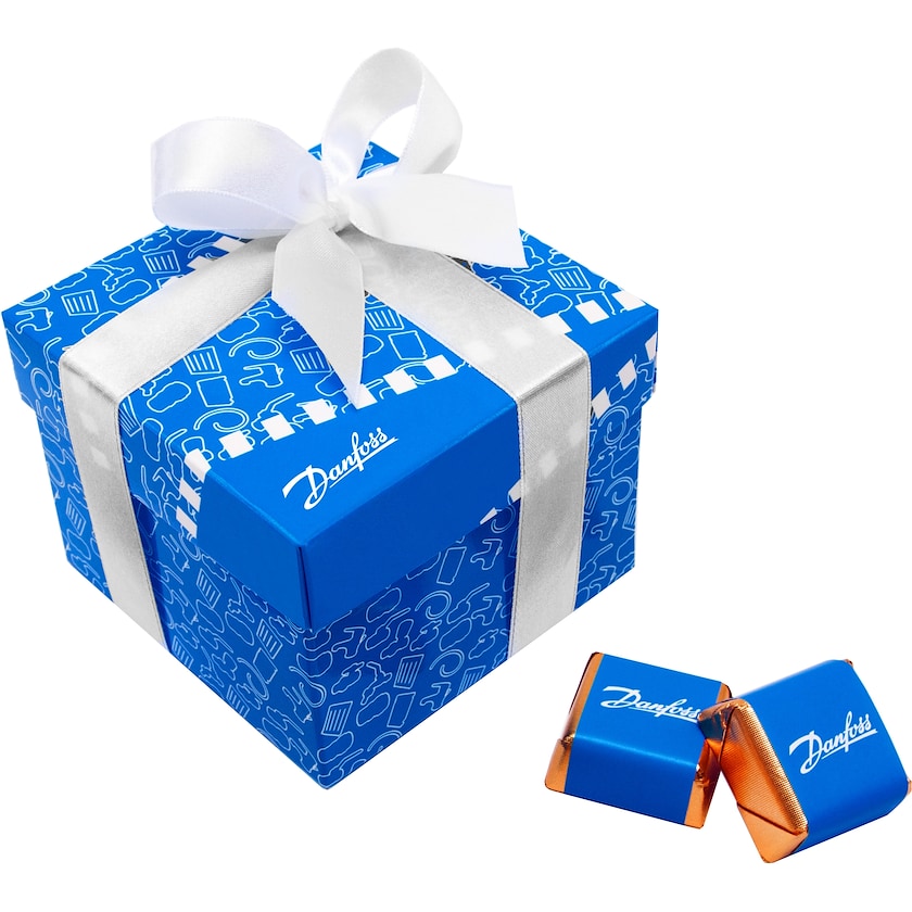 Pralinenschachtel gefüllt mit 16 gefüllten Schokoladenpralinen. Die Schokoladenpralinen sind in den Geschmacksrichtungen Schokolade, Pistazie und Geschmacksmischung erhältlich. Sowohl die Pralinenschachtel als auch die Banner rund um die Pralinen werden mit Ihrem Aufdruck versehen. Die Pralinenschachtel ist außerdem mit einem Seidenband in beliebiger Farbe versehen.