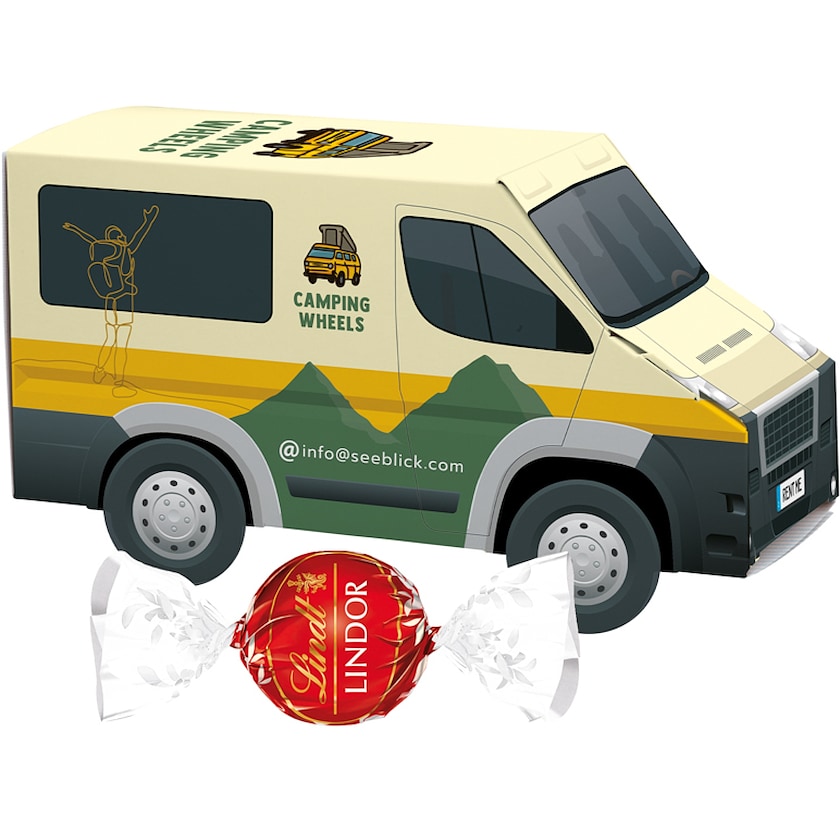Ein Lieferwagen gefüllt mit 3 Lindt Lindor-Pralinen. Die Verpackung besteht aus FSC-zertifiziertem Papier. Die gesamte Außenseite lässt sich individuell nach Ihren Wünschen bedrucken.