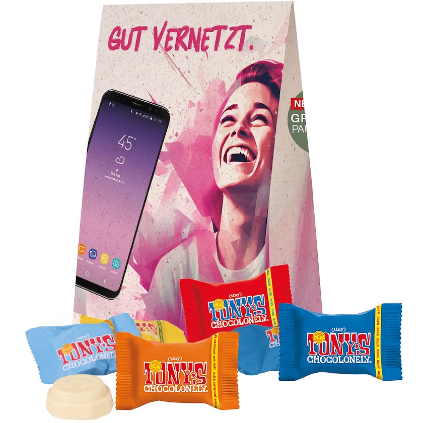 Umweltfreundliche Pappschachtel mit 8 Tiny Tony's in verschiedenen Geschmacksrichtungen. Der Karton besteht aus umweltfreundlichem Graspapier und wird nach Ihren Wünschen bedruckt.