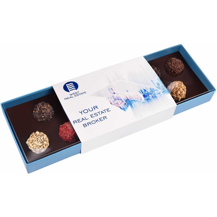 Pralinenschachtel mit 12 köstlichen Schokoladentrüffeln. Die Schokoladentrüffel gibt es in gemischten Geschmacksrichtungen. Beispielsweise Cheesecake, Cranberry, Karamell und Maracuja. Der Druck befindet sich auf einem Banner, das um die Pralinenschachtel herum platziert wird. Sie bestimmen auch den Druck auf den Karton und seiner Innenseite.