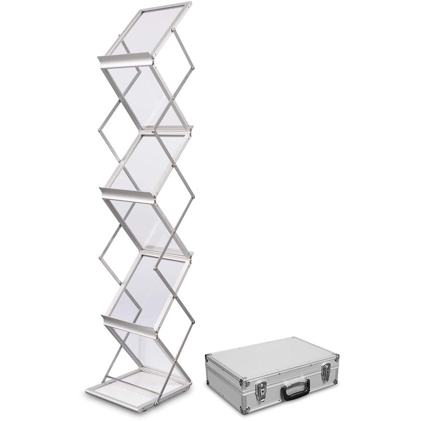 Stilvoller Prospektständer aus Aluminium mit robuster Aufbewahrungstasche. Der Flex Suitcase ist mit 6 Fächern für A4-Broschüren ausgestattet. Jedes Fach misst 30,5 x 22 cm. Zusammengeklappt misst der Prospektständer 146 cm in der Höhe. Zusammengeklappt betragen die Maße 11 x 25,6 x 40 cm. Die Montage erfolgt schnell und erfordert kein Werkzeug. Wird mit einem robusten Aufbewahrungskoffer aus Aluminium geliefert. 1 Jahr Garantie.