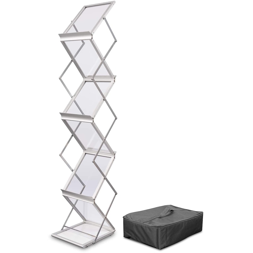 Stilvoller Prospektständer aus Aluminium. Flex Standard verfügt über 6 Fächer für A4-Broschüren. Jedes Fach misst 30,5 x 22 cm. Zusammengeklappt misst der Prospektständer 146 cm in der Höhe. Zusammengeklappt betragen die Maße 11 x 25,6 x 40 cm. Die Montage erfolgt schnell und erfordert kein Werkzeug. Wird mit einer praktischen Aufbewahrungstasche geliefert. 1 Jahr Garantie.