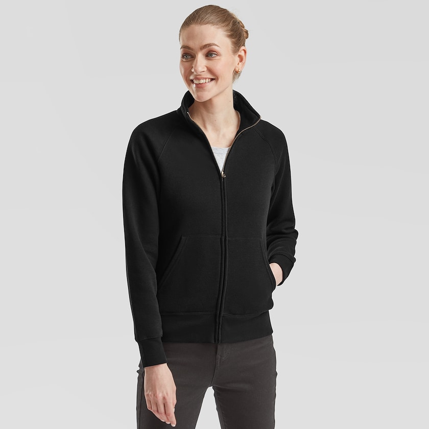 Hübscher Pullover mit hohem Kragen und Reißverschluss. Lady-Fit Premium Sweat Jacket hat eine höhere Polyestermischung als gewöhnlich, woduch das Kleidungsstück robuster ist. Wird in Plastikhülle verpackt geliefert. Gibt es auch als Herrenmodell.