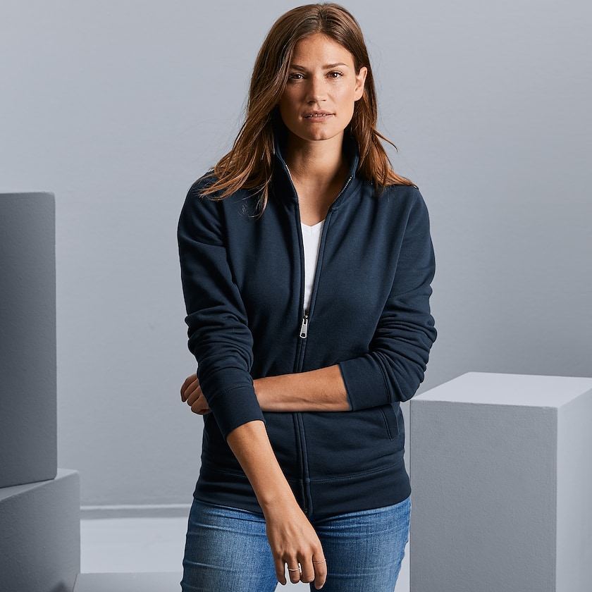 Sweatshirt mit durchgängigem Reißverschluss und geradem Schnitt. An den Seiten befinden sich Taschen. Die Markierung kann an der Brust mit Druck oder Stickerei erfolgen, oder am Rücken nur mit Druck. Gibt es auch als Herrenmodell.