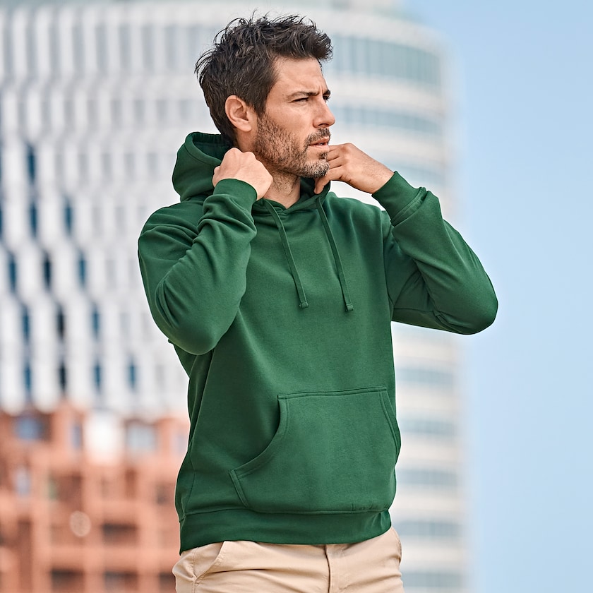 Hochwertigen Hoodie bedrucken von Tee Jays. Der Pullover besteht aus 70 % Bio-Baumwolle und 30 % Polyester. Der Stoff ist doppelt eingefärbt und die Bündchen angenehm elastisch dank Elasthananteil.