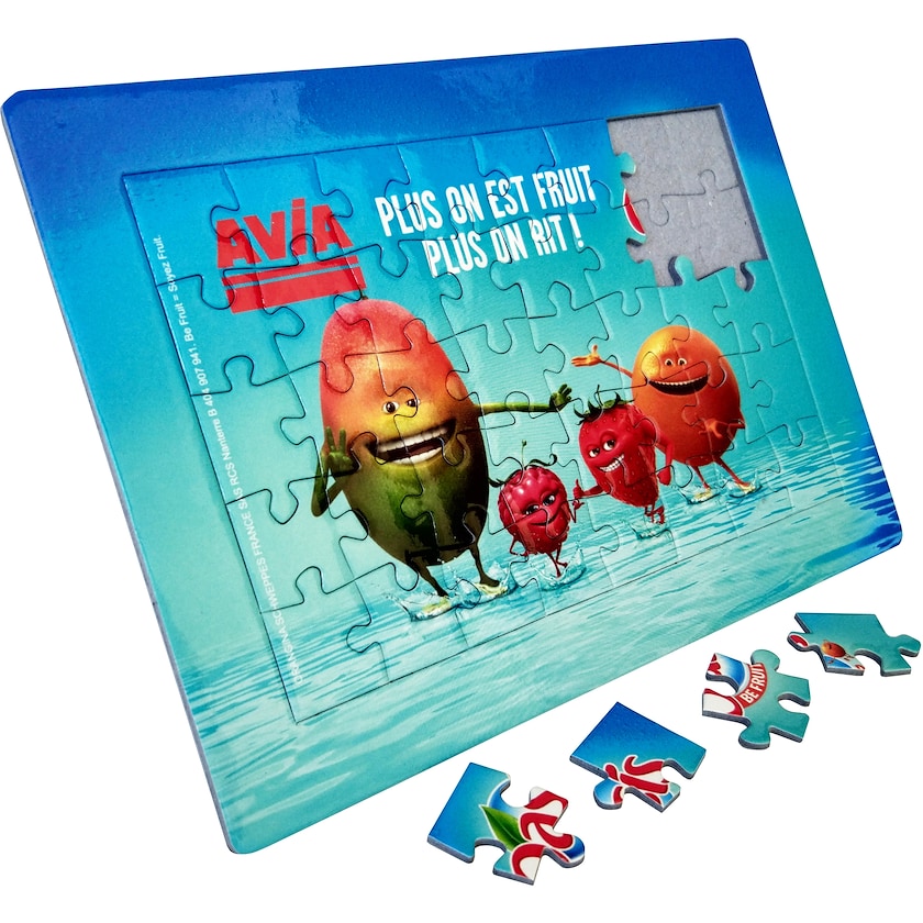 Puzzle mit 40 Teilen. Die ganze Oberseite wird im 4-Frabdruck nach Ihren Wünschen bedruckt. Laden Sie sich die Druckvorlage runter und entwerfen Sie ihr eigenes Puzzle.