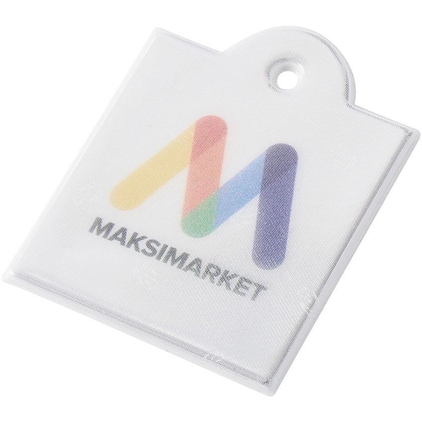 Weich-Reflektor in Form einer Einkaufstasche. Der Reflektor wird mit Schnur und Sicherheitsnadel oder mit Metallkette geliefert. Das Reflektormaterial ist von 3M Scotchlite und entspricht EN13356:2001. Um den Reflektor in seinem Reflektiervermögen nicht zu beschädigen, erfolgt der Druck unter der Oberfläche.
