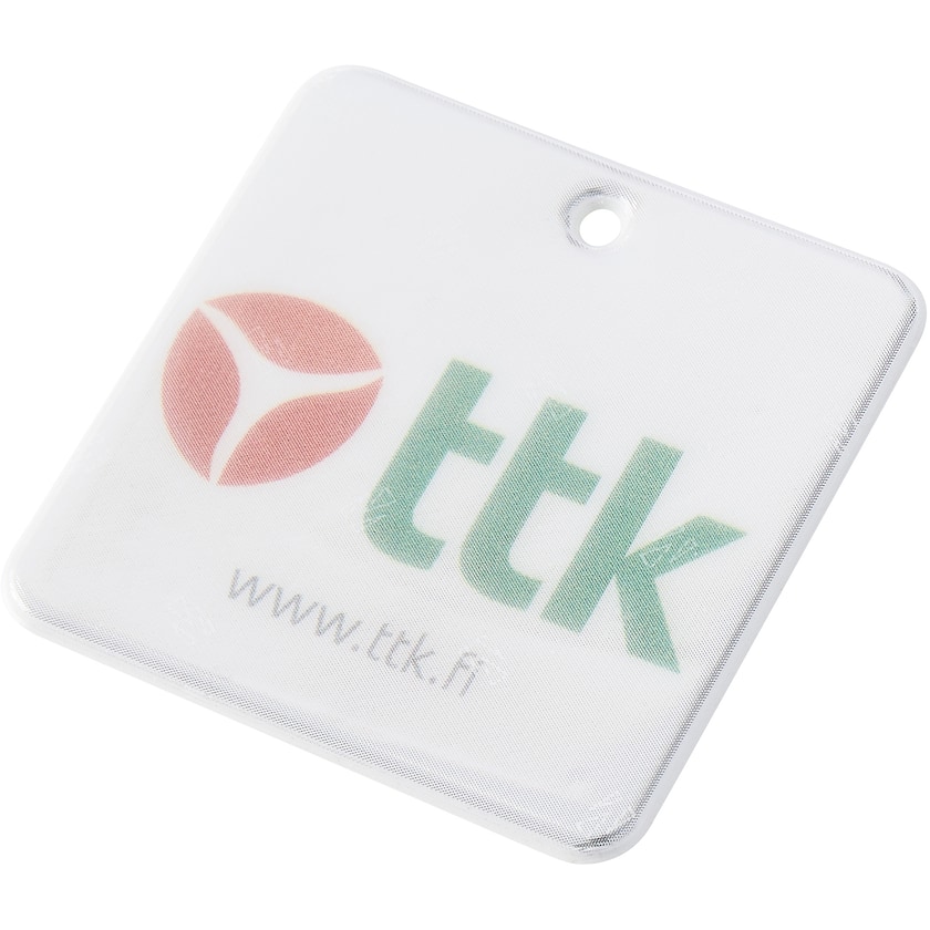 Quadratischer Weich-Reflektor. Der Reflektor wird mit Schnur und Sicherheitsnadel oder mit Metallkette geliefert. Das Reflektormaterial ist geprüft und entspricht EN13356:2001. Um den Reflektor nicht zu beschädigen, erfolgt der Druck unter der Oberfläche.