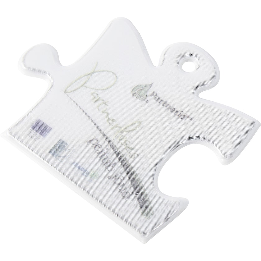 Lustiger Reflektor in Form eines Puzzleteils. Der Reflektor wird mit Schnur und Sicherheitsnadel oder mit Metallkette geliefert. Das Reflektormaterial ist von 3M Scotchlite und entspricht EN13356:2001. Um den Reflektor in seinem Reflektiervermögen nicht zu beschädigen, erfolgt der Druck unter der Oberfläche.
