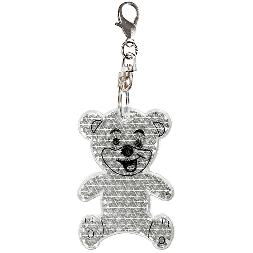 Harter Reflektor in Bärchenform. Der Reflektor wird mit einem Karabiner z.B. am Rucksack befestigt.