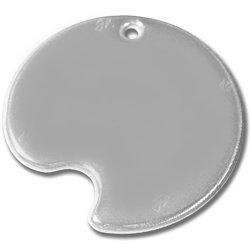 Lustiger Weich-Reflektor in Form einer Malerpalette. Der Reflektor wird mit Schnur und Sicherheitsnadel oder mit Metallkette geliefert. Das Reflektormaterial ist von 3M Scotchlite und entspricht EN13356:2001. Um den Reflektor in seinem Reflektiervermögen nicht zu beschädigen, erfolgt der Druck unter der Oberfläche.