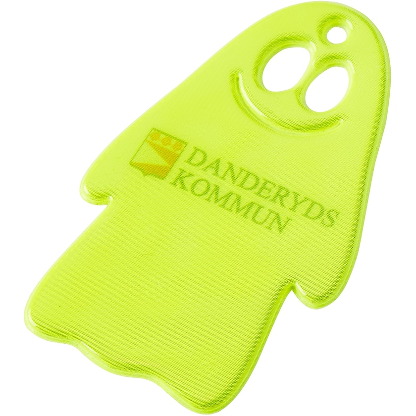 Weich-Reflektor in Form eines lächelnden Gespenstes. Der Reflektor wird mit Schnur und Sicherheitsnadel oder mit Metallkette geliefert. Das Reflektormaterial ist geprüft und entspricht EN13356:2001. Um den Reflektor nicht zu beschädigen, erfolgt der Druck unter der Oberfläche.