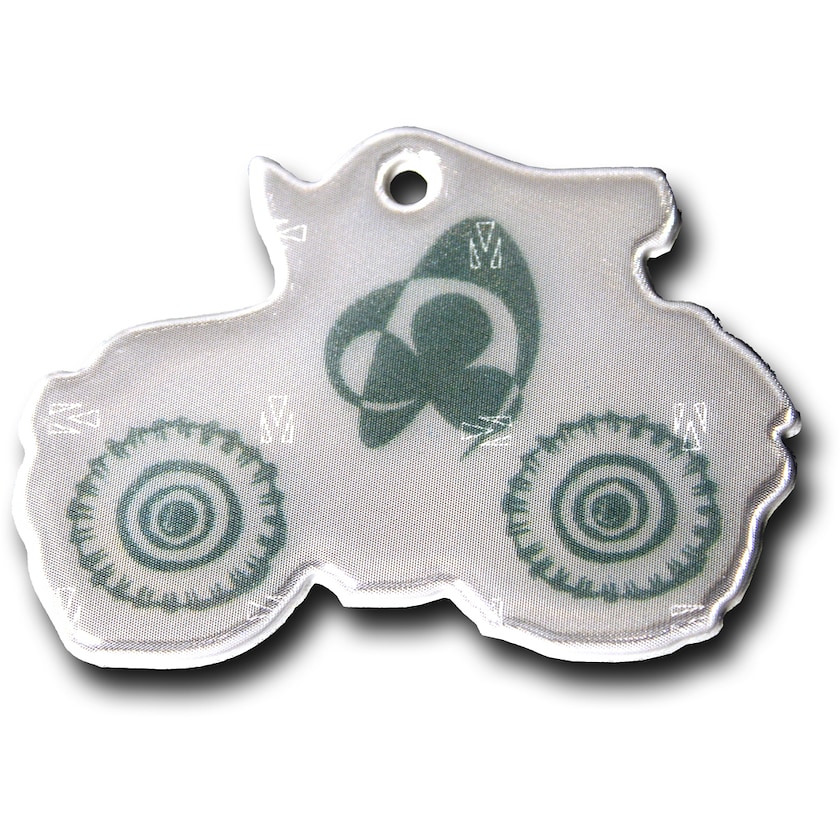 Weich-Reflektor in Form eines Traktors. Der Reflektor wird mit Schnur und Sicherheitsnadel oder mit Metallkette geliefert. Das Reflektormaterial ist von 3M Scotchlite und entspricht EN13356:2001. Um den Reflektor in seinem Reflektiervermögen nicht zu beeinträchtigen, erfolgt der Druck unter der Oberfläche.
