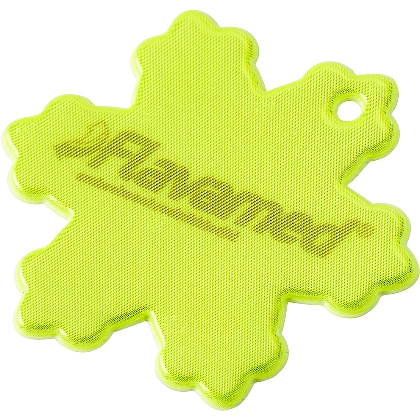 Weich-Reflektor in Form einer Schneeflocke. Der Reflektor wird mit Schnur und Sicherheitsnadel oder mit Metallkette geliefert. Das Reflektormaterial ist von 3M Scotchlite und entspricht EN13356:2001. Um den Reflektor in seinem Reflektiervermögen nicht zu beeinträchtigen, erfolgt der Druck unter der Oberfläche.