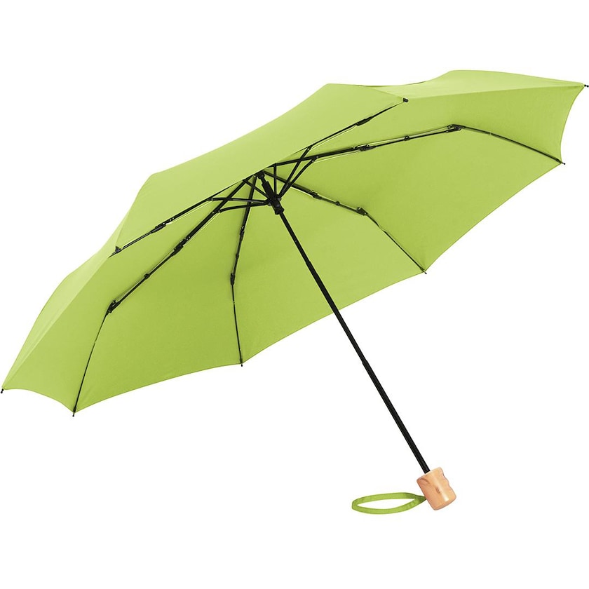 Umweltfreundlicher Regenschirm von Fare mit sturmsicherer Konstruktion. Der Stoff besteht aus recyceltem Polyester, zertifiziert nach STANDARD 100 by OEKO-TEX®. Der Griff ist aus Echtholz.