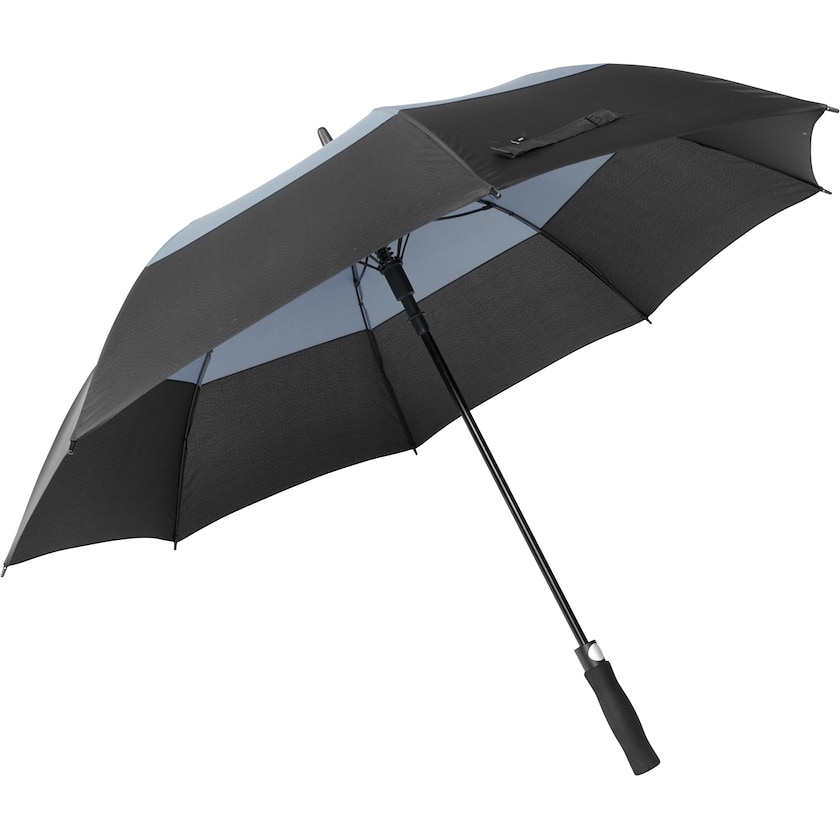 Großer Golfschirm aus umweltfreundlichem Material. Der Stoff besteht aus rPET, also recycelten PET-Flaschen. Schienen und Schirmstange bestehen aus Fiberglas und der Griff aus weichem Schaumstoff.
